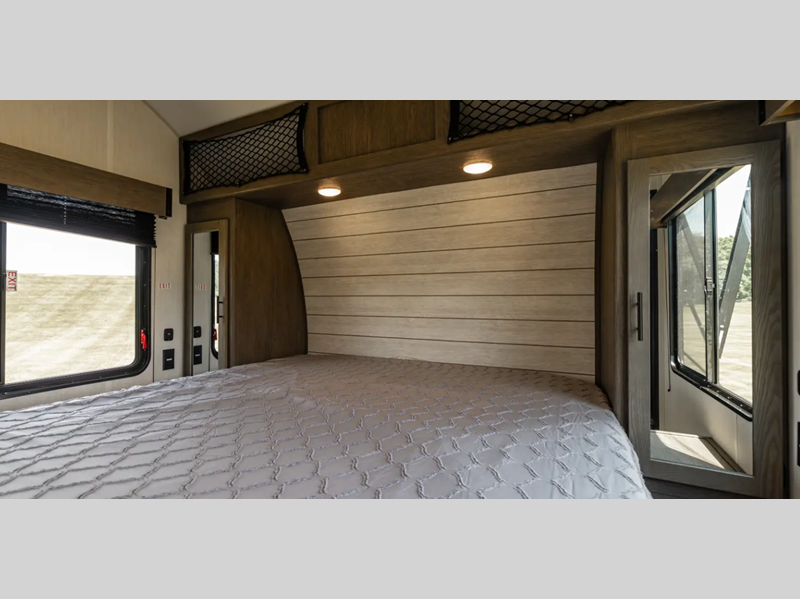 Sleeps 2 Length 31 ft 9 in Ext Width 8 ft 6 in Ext Height 12 ft 5 in Hitch Weight 1115 lbs GVWR 11315 lbs Dry Weight 6688 lbs Cargo Capacity 4627 lbs Fresh Water Capacity 81 gals Grey Water Capacity 44 gals Black Water Capacity 44 gals Furnace BTU 35000 btu Available Beds RV King Refrigerator Type 12V Refrigerator Size 10 cu ft Cooktop Burners 3 Number of Awnings 1 Garage Size 22 ft Water Heater Type On Demand Tankless AC BTU 15000 btu TV Info LR 50" TV Awning Info 18' Power w/LED Accent Lighting Axle Count 2 Shower Type Standard Similar Floorplans