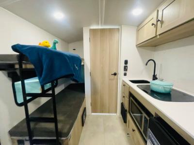 Perfect for couples, families, or friends, this trailer offers a comfortable and functional space to relax, recharge, and explore. The full bathroom is a serene retreat, equipped with everything you need to refresh and rejuvenate after a day of adventure. The two bunk beds give a snug and inviting sleeping spot, perfect for kids or adults looking for a cozy spot to rest. The kitchen is equipped with a microwave for quick and easy meal prep, and a fridge to keep your favorite snacks and drinks fresh. Overhead cabinets provide plenty of storage for your gear, cookware, and essentials, keeping your trailer tidy and organized. The bed offers a restful sleeping space, perfect for unwinding after a long day of exploring.