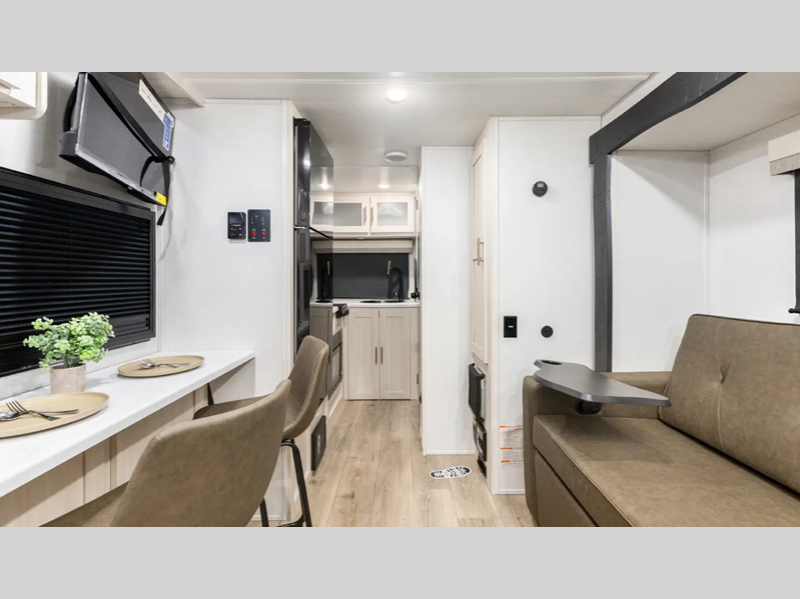 Sleeps 3 Slides 1 Length 25 ft Ext Width 8 ft Ext Height 10 ft 10 in Hitch Weight 340 lbs Dry Weight 4574 lbs Cargo Capacity 1510 lbs Fresh Water Capacity 30 gals Grey Water Capacity 60 gals Black Water Capacity 30 gals Available Beds Queen Refrigerator Type 12V Black Glass Convection Cooking Yes Cooktop Burners 2 Number of Awnings 1 Water Heater Type Tankless AC BTU 15000 btu TV Info 12V TV Awning Info 12' Power Axle Count 1 Shower Type Standard Electrical Service 30 amp Similar Floorplans