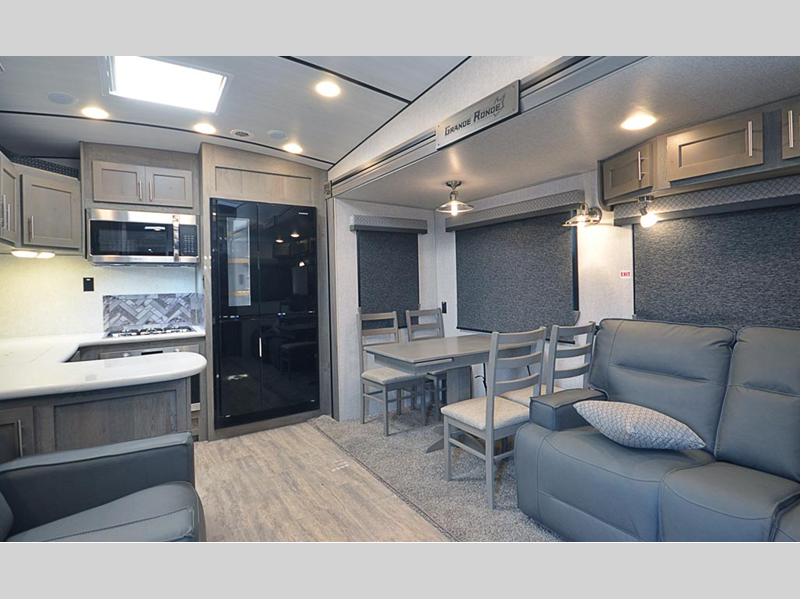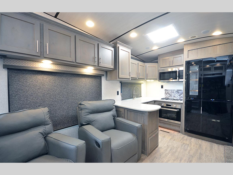 Sleeps 6 Slides 2 Length 35 ft 1 in Ext Width 8 ft 6 in Ext Height 13 ft 6 in Interior Color Carbon, Moonstone Hitch Weight 2280 lbs GVWR 15600 lbs Dry Weight 12490 lbs Cargo Capacity 3110 lbs Fresh Water Capacity 88 gals Grey Water Capacity 72 gals Black Water Capacity 65 gals Tire Size LT235/85R16 Furnace BTU 35000 btu Available Beds King Refrigerator Size 12 cu ft Convection Cooking Yes Cooktop Burners 3 Number of Awnings 1 Axle Weight 10210 lbs LP Tank Capacity 80 lbs. Water Heater Capacity 16 gal Water Heater Type Gas/Electric Quick Recovery AC BTU 13500 btu TV Info LR 40" 110 LED Smart TV Awning Info 16' 6" 12V LED w/Adjustable Pitch Axle Count 2 Washer/Dryer Available Yes Shower Type Shower w/Seat Electrical Service 50 amp Similar Floorplans