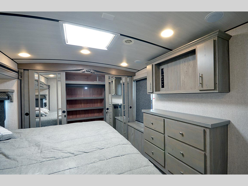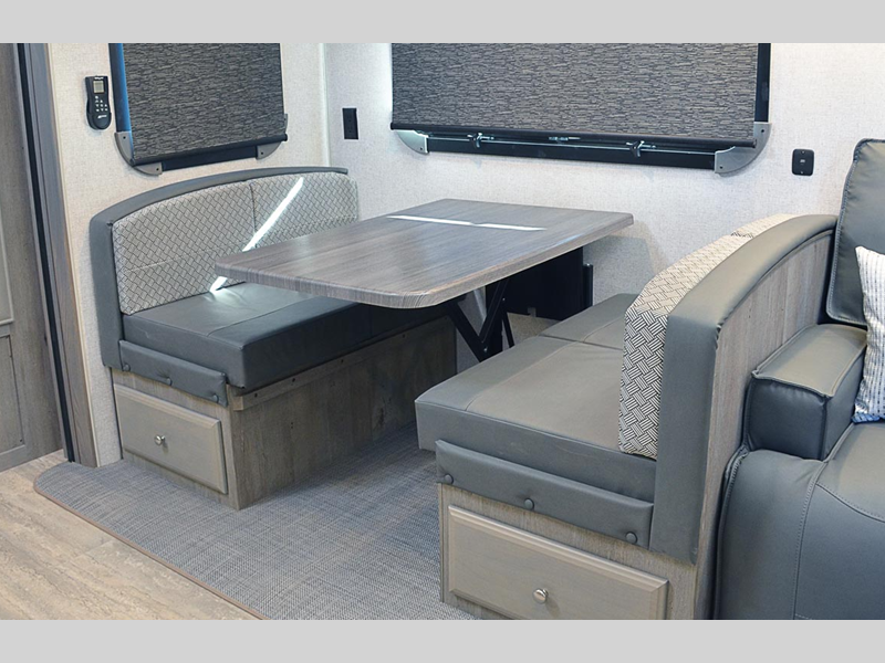 Sleeps 4 Slides 2 Length 34 ft 7 in Ext Width 8 ft 6 in Ext Height 13 ft 4 in Interior Color Carbon, Moonstone Hitch Weight 2490 lbs GVWR 15800 lbs Dry Weight 12630 lbs Cargo Capacity 3170 lbs Fresh Water Capacity 88 gals Grey Water Capacity 67 gals Black Water Capacity 65 gals Tire Size LT235/85R16 Furnace BTU 35000 btu Available Beds King Refrigerator Type 12V Refrigerator Size 10 cu ft Convection Cooking Yes Cooktop Burners 3 Number of Awnings 1 Axle Weight 10140 lbs LP Tank Capacity 80 lbs Water Heater Capacity 16 gal Water Heater Type DSI Gas/Electric with Quick Recovery AC BTU 13500 btu TV Info LR 40" LED Smart TV Awning Info 18' 12V LED w/Adjustable Pitch Axle Count 2 Washer/Dryer Available Yes Shower Type Shower w/Seat Similar Floorplans