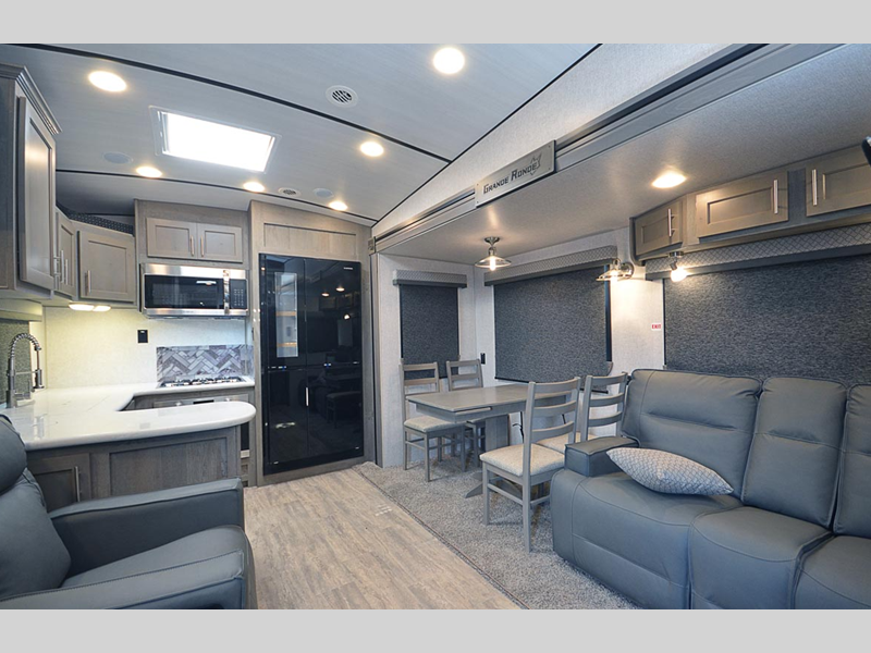 Sleeps 4 Slides 3 Length 39 ft 8 in Ext Width 8 ft 6 in Ext Height 13 ft 5 in Interior Color Carbon, Moonstone Hitch Weight 2830 lbs GVWR 16300 lbs Dry Weight 14520 lbs Cargo Capacity 1780 lbs Fresh Water Capacity 88 gals Grey Water Capacity 67 gals Black Water Capacity 65 gals Tire Size LT235/85R16 Furnace BTU 35000 btu Available Beds King Refrigerator Size 14 cu ft Convection Cooking Yes Cooktop Burners 3 Number of Awnings 1 Axle Weight 11690 lbs LP Tank Capacity 80 lbs Water Heater Capacity 16 gal Water Heater Type DSI Gas/Electric with Quick Recovery AC BTU 15000 btu TV Info LR 42" 110 LED Smart TV Awning Info 14' 12V LED w/Adjustable Pitch Axle Count 2 Shower Type Shower w/Seat Electrical Service 30 amp Similar Floorplans