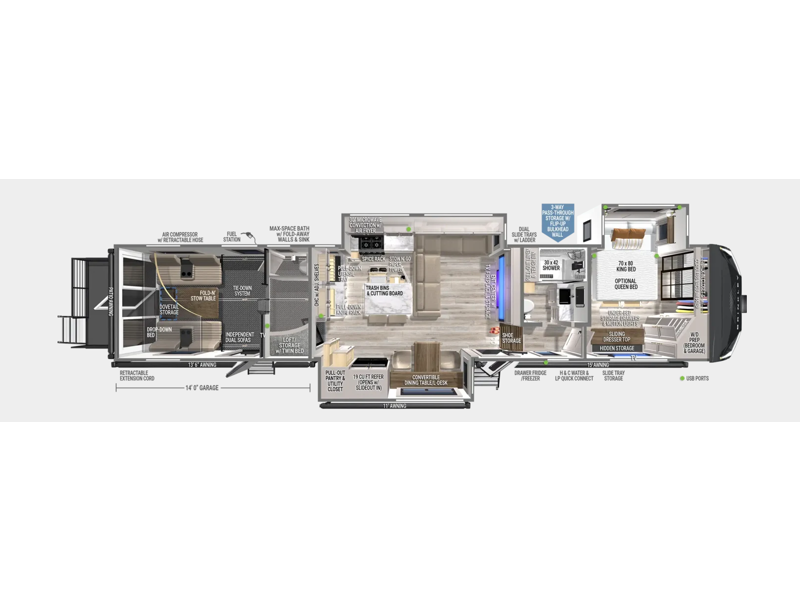 The 14-foot garage adapts to whatever your journey demands—cargo hauler, bunk room, remote office, or outdoor hangout. Key features include: