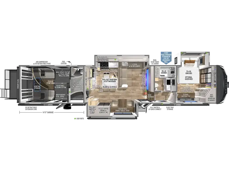 The 14-foot garage adapts to whatever your journey demands—cargo hauler, bunk room, remote office, or outdoor hangout. Key features include: