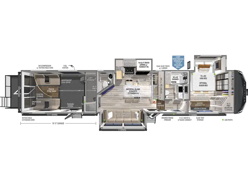 - King-size bed slide-out with under-bed storage drawers and motion-activated lighting
