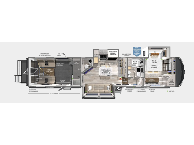 The garage/flex space is more than just cargo storage—it’s a multipurpose zone that adapts to your lifestyle. Use it as a bunkhouse, office, lounge, or all three. Features include: