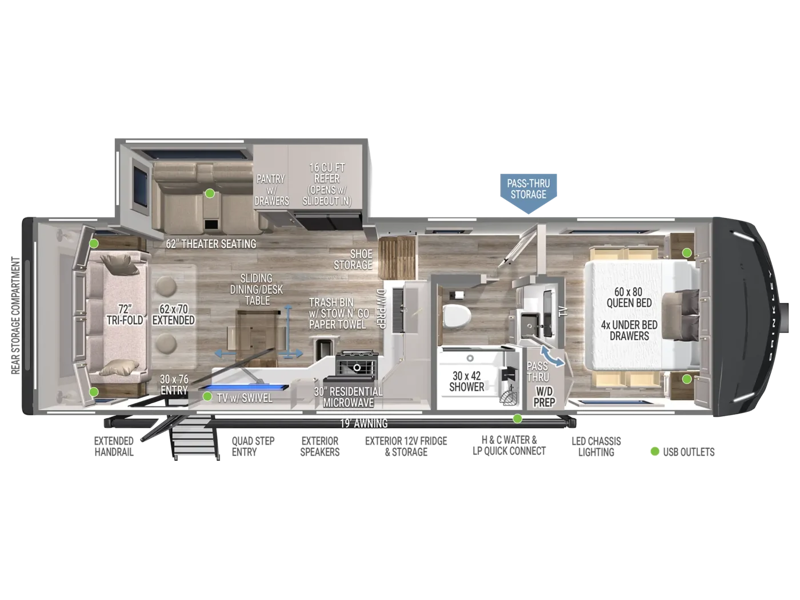 - Mid-Coach Pass-Through Storage Compartment w/ Motion Lighting & Power Outlets Storage Compartment (Heated & Insulated)