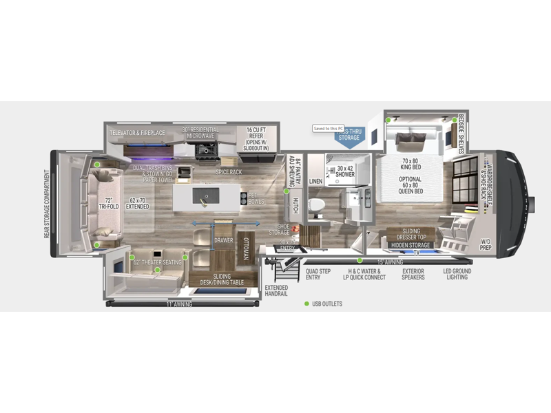 Step into the bright, open living and kitchen space, made even more spacious by dual opposing slide-outs. Enjoy comfortable seating with a 72" tri-fold sofa, 62" theater seats, and a free-standing dinette featuring a built-in utensil drawer.