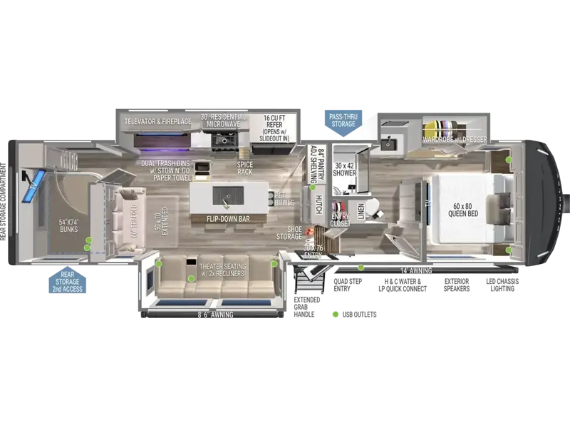 Step inside the wide-open living and kitchen area with dual slides and enjoy premium seating, including a large theater seat with two recliners and a 60" tri-fold sofa. Watch your favorite shows on the televator Smart TV above the fireplace for a true residential entertainment experience.