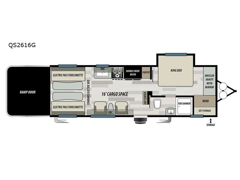 16' of cargo space is plenty of room to bring your favorite off-road toys in this toy hauler! The private bedroom is up front with a convenient entrance into the bathroom, as well as a dresser vanity mirror and a wardrobe. The dual entry bathroom has a tub/shower for you to wash the mud out of your hair and the outside shower allows you to rinse the mud off your feet before entering. After eating a meal at the electric pass-through dinette, you can relax in one of the lounge chairs with table to set your coffee on while you enjoy the entertainment center. The fiberglass exterior will protect your unit for years of fun!